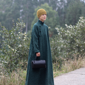 复古盘扣提花袍子 a型超长超宽松连衣裙 中式立领禅意秋棉麻长袍