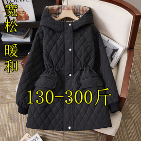 300斤特大码菱形格连帽棉服女冬200胖mm加肥宽松防风保暖棉衣外套