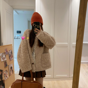 小羊咩咩!宽松慵懒短款毛毛外套女冬休闲上衣羊羔毛皮毛一体皮草