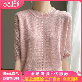 夏季新款蕾丝镂空天丝针织短袖女圆领五分袖上衣宽松珍珠半袖T恤