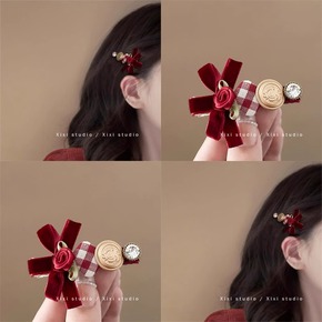 冬季纽扣发夹甜美少女侧边刘海夹复古红色蝴蝶结圣诞发饰新年头饰