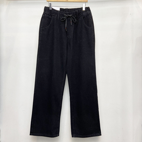 新款休闲松紧腰宽松男女港风阔裤腿老爹直筒纯黑色宽脚系绳牛仔裤