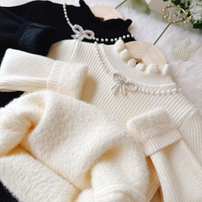 女童2025冬季新款加厚毛衣花边领宝宝一体绒打底衫加绒儿童针织衫