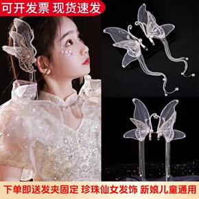 女童头饰珍珠发饰新娘婚纱蝴蝶流苏对夹婚礼生日演出女孩韩式发夹