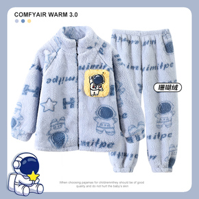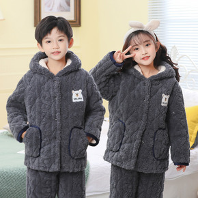 儿童睡衣秋冬季加厚款三层夹棉男童孩珊瑚绒法兰绒睡袍浴袍家居服