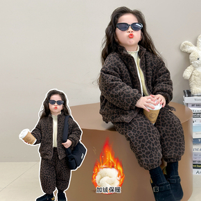 女童运动服套装冬季新款女孩加绒加厚韩版休闲两件套宝宝豹纹棉衣