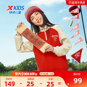 福燈贺岁|特步童装女童立领新款卫衣2026年秋冬新款红色拼接上衣