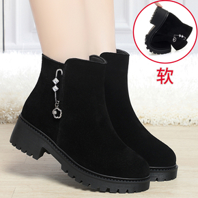 真皮中跟妈妈短靴女秋冬季棉鞋翻毛粗跟加绒加厚磨砂皮软底羊毛靴