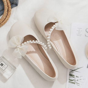 羊皮版~春新款网红浅口平底晚晚鞋温柔配裙子蝴蝶结单鞋女仙女风
