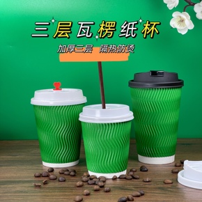 品质好货绿色瓦楞纸杯【500只】双层加厚防烫奶茶咖啡豆浆带盖