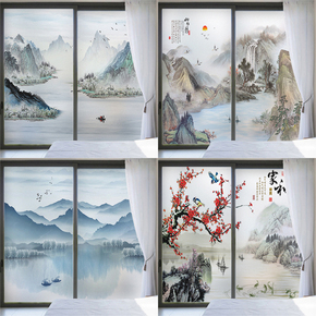 山水画玻璃贴膜透光不透明浴室移门卫生间窗户防走光静电磨砂贴纸