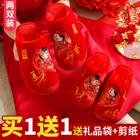 买一送一婚庆拖鞋结婚情侣大红色居家棉拖鞋女创意卡通棉鞋男冬季