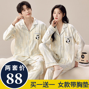 自带胸垫情侣睡衣女士春秋款秋季开衫纯棉长袖家居服翻领男款套装