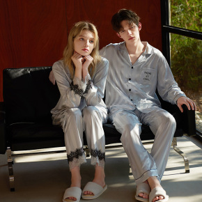 马克公主条纹情侣睡衣女春夏季冰丝长袖蕾丝高级感丝绸男士家居服