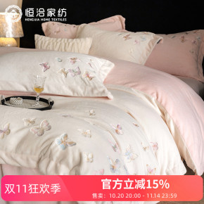 冬季少女心加厚牛奶绒四件套蝴蝶刺绣保暖被套床上用品白粉色床笠