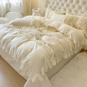 法式轻奢奶油风全棉床上四件套公主风纯棉蕾丝花边被套床单床笠夏