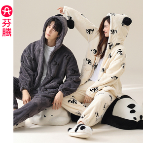 芬腾秋冬情侣睡衣女珊瑚绒熊猫连帽男抗静电保暖法兰绒家居服套装