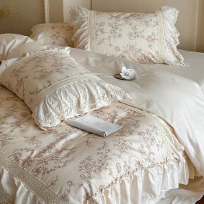 法式复古印花全棉床裙款四件套公主风纯棉荷叶花边田园被套少女心