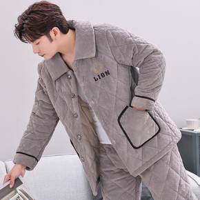 睡衣男士冬季三层加厚珊瑚绒夹棉保暖加绒法兰绒家居服套装秋冬款