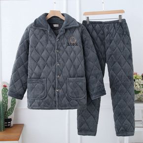 冬天穿睡衣男冬加绒加厚珊瑚绒三层夹棉中老年宽松保暖套家居套装