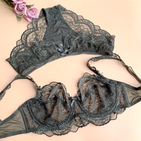 小芬欧美风超薄杯大胸显小薄款性感透明文胸女套装蕾丝内衣女薄款