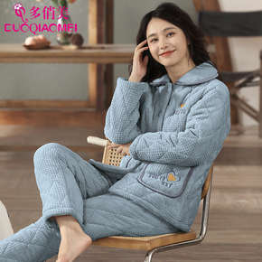 睡衣女士冬天三层加厚夹棉袄珊瑚绒法兰绒加绒保暖秋冬季新款套装