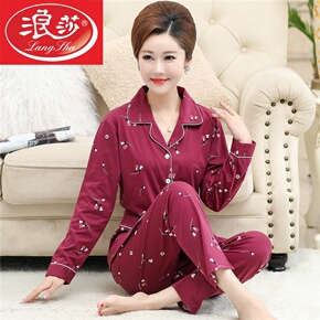 中年妈妈睡衣女春秋季纯棉长袖开衫中老年人加大码全棉家居服套装