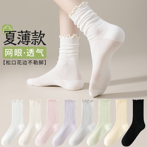 白色中筒袜子女夏季薄款堆堆袜纯棉纱无骨网眼透气冰冰花边月子袜