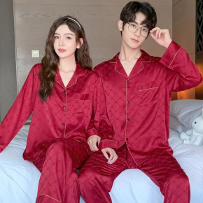 春秋款情侣冰丝睡衣一男一女红色结婚新婚丝绸家居服夏季薄款套装