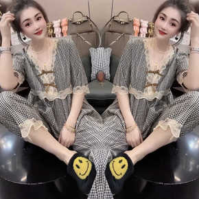 韩版格子棉麻家居服女夏薄款网红短袖长裤睡衣时尚两件套蕾丝拼接