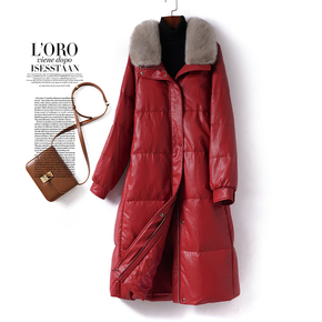 真皮羽绒服女中长款红色水貂毛领绵羊皮衣海宁新款90白鸭绒外套